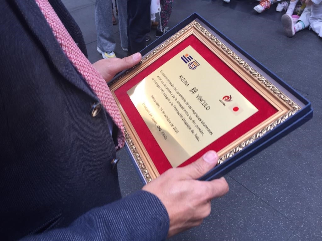 (100着の柔道着と共に、眞銅大使から贈られた記念プレート。左からエリセオ・ルックス柔道連盟会長、眞銅大使)