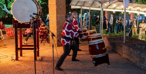 今年は緑豊かな公邸の庭を広く使い、開放的かつ親しみのある雰囲気の中、様々な日本文化をご紹介しました。セレモニーの後には、毎年恒例となっているモンテビデオ太鼓による迫力ある和太鼓演奏が披露されました。その後、岡本悟公邸料理人による寿司の実演が行われ、来場者は握りたての寿司を楽しみました。寿司に加えて、天ぷら、牛肉八幡巻き、筑前煮など、料理人が腕を振るった様々な日本食が、日本人会料理部の支援も得つつ、提供されました。