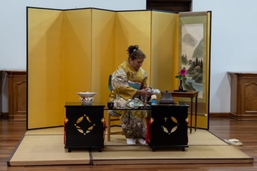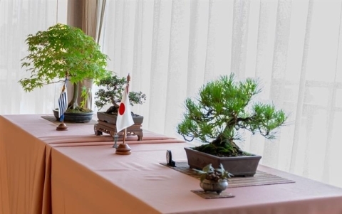 屋内では、着物の展示と茶道のデモンストレーションを行い、お客様にお茶を振る舞いました。また、公邸内の各所には、栄えある設立20 周年を昨年迎えたウルグアイ盆栽協会の協力により、丹精込められた見事な盆栽が展示されました。